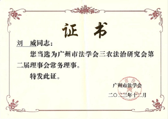 伯方喜讯 | 本所高级合伙人、执行主任刘威律师当选为广州市法学会三农法治研究会第二届理事会常务理事