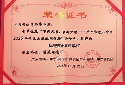 - 伯方动态 |广东伯方律师事务所受邀参与广州市铁一中学职业规划活动 荣获“优秀校企共建单位”称号[2025-12-12]